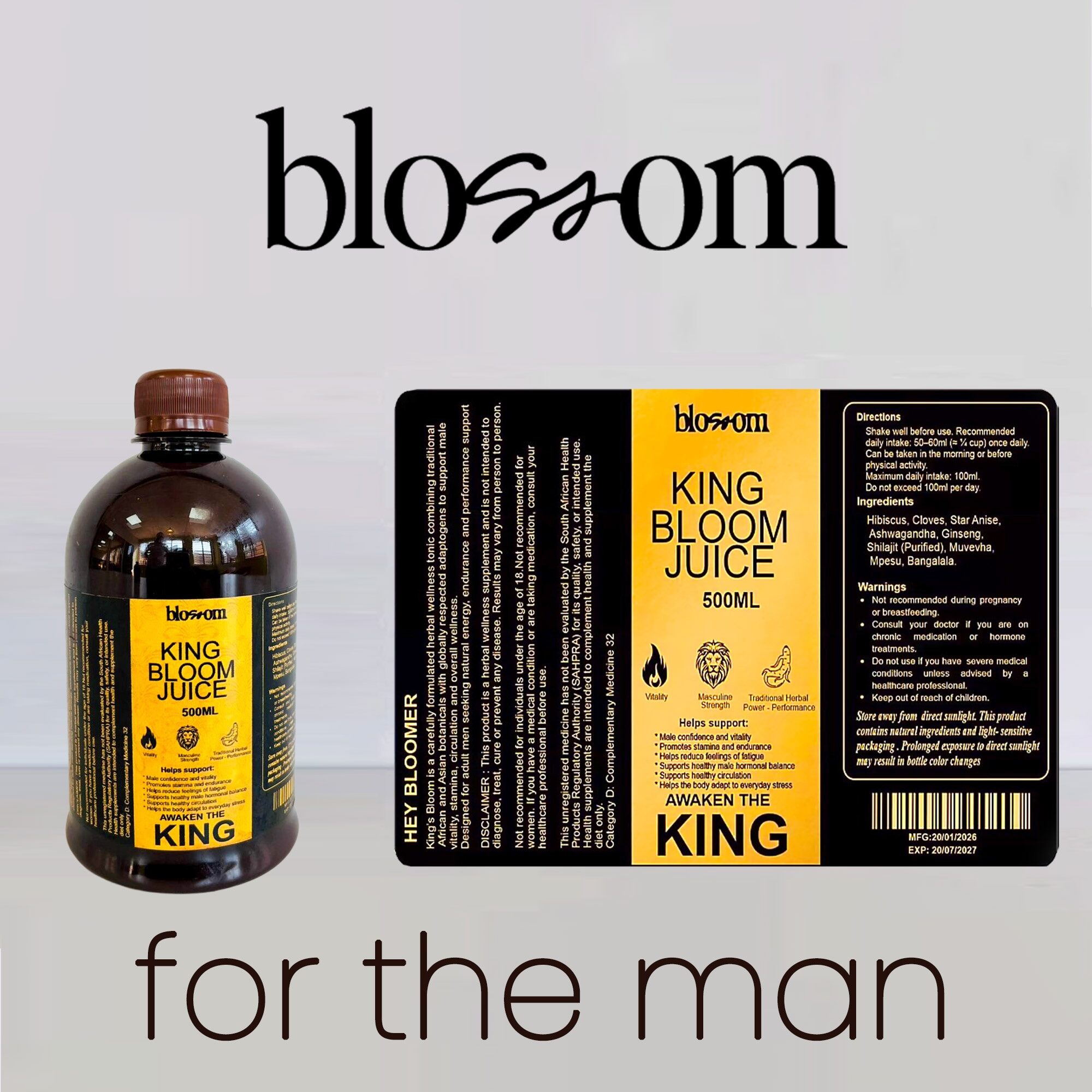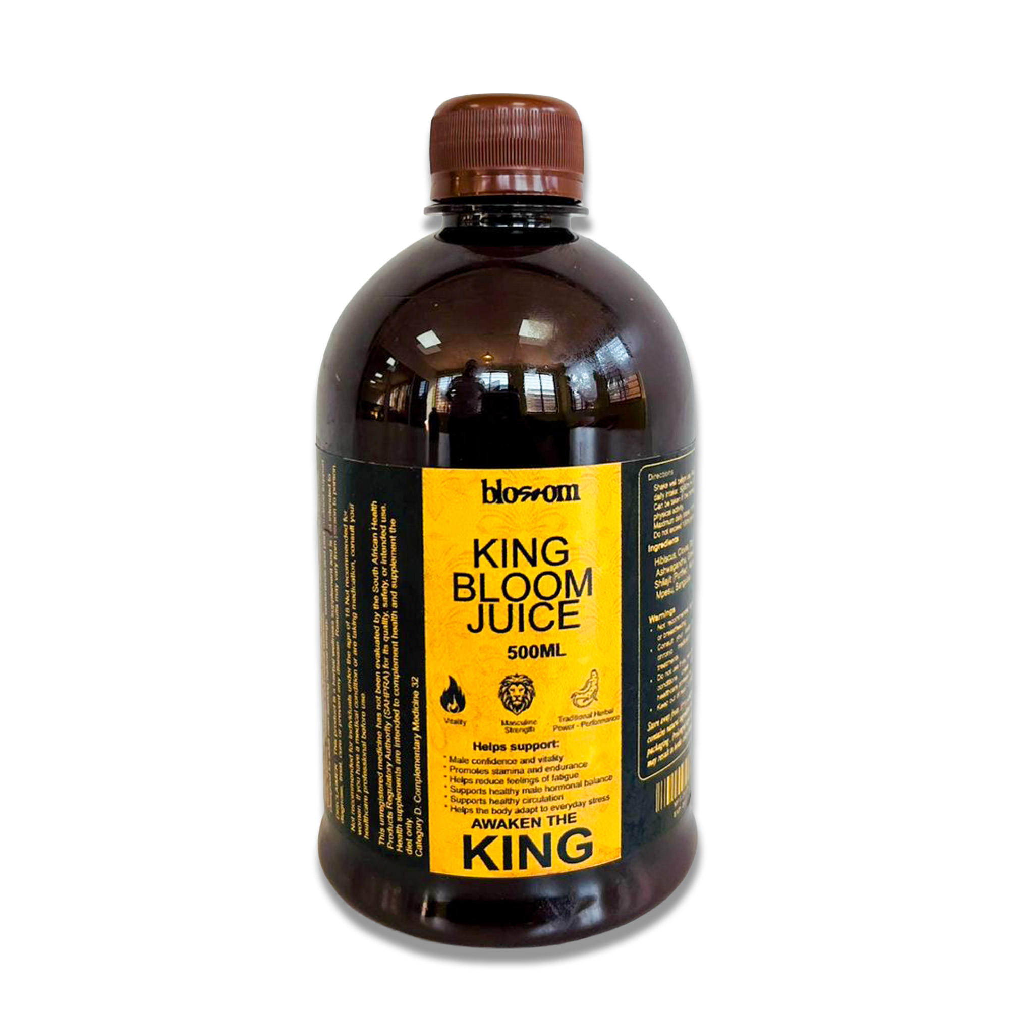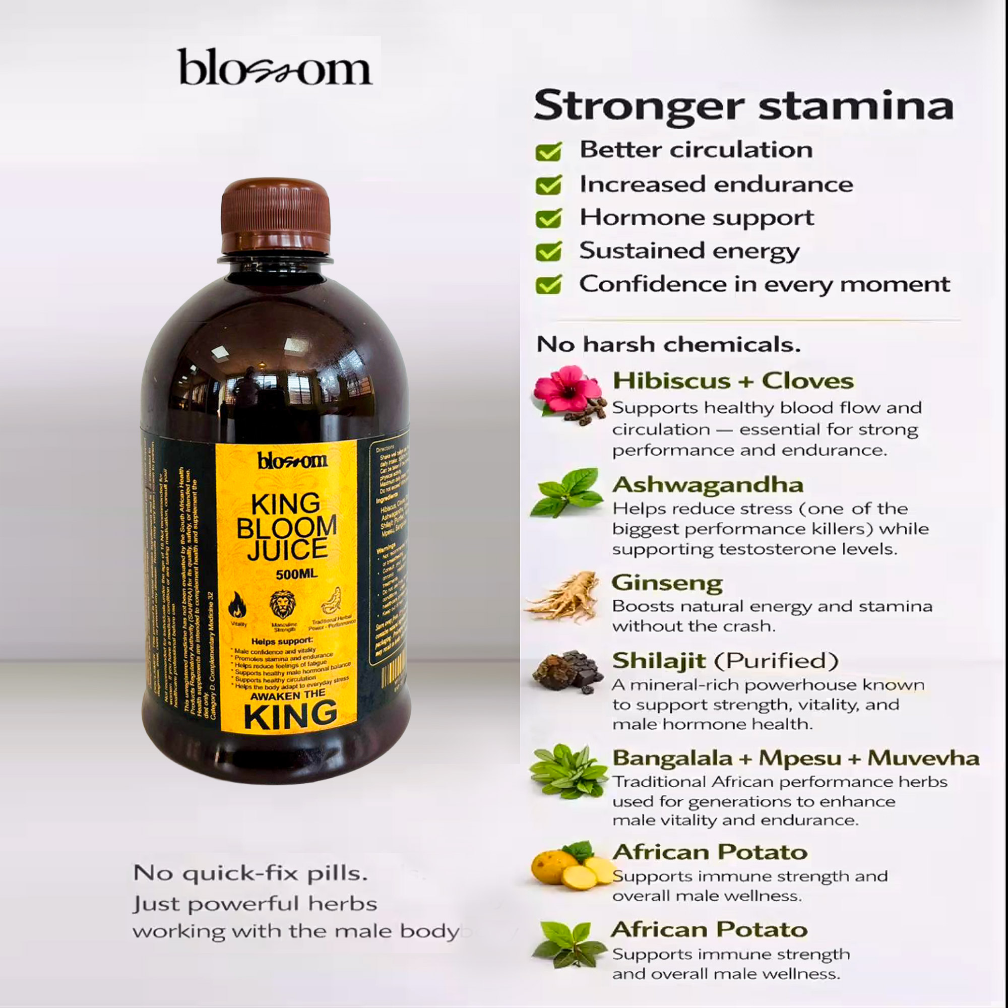 Blossom King Bloom Juice is a carefully formulated herbal wellness tonic combining traditional African and Asian botanicals with globally respected adaptogens to support male vitality, stamina, circulation and overall wellness.